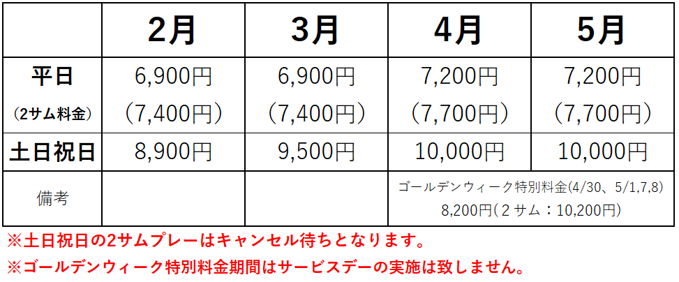 ※特別料金期間(ゴールデンウィーク、お盆、年末年始)、ゴルフ場主催コンペは対象外となります。