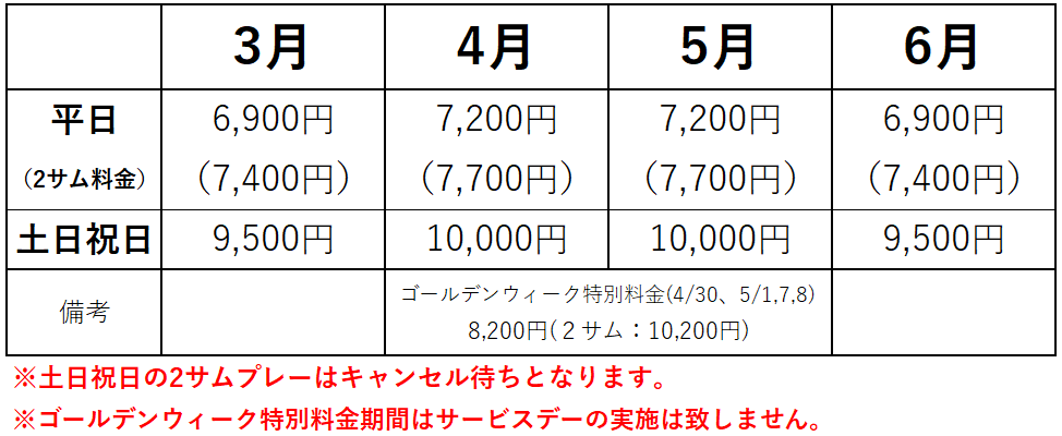※特別料金期間(ゴールデンウィーク、お盆、年末年始)、ゴルフ場主催コンペは対象外となります。